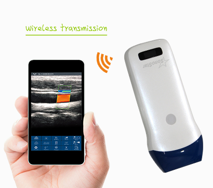 Ny trådløs håndholdt ultralyd probe som bruker iPhone/iPad som skjerm og kontrollenhet. Proben er ikke stort større enn en vanlig probe og veier kun 250gram. Lommeultralyd med samme funksjonalitet som store maskiner; b-mode, m-mode, farge Doppler, power Doppler og PW Doppler